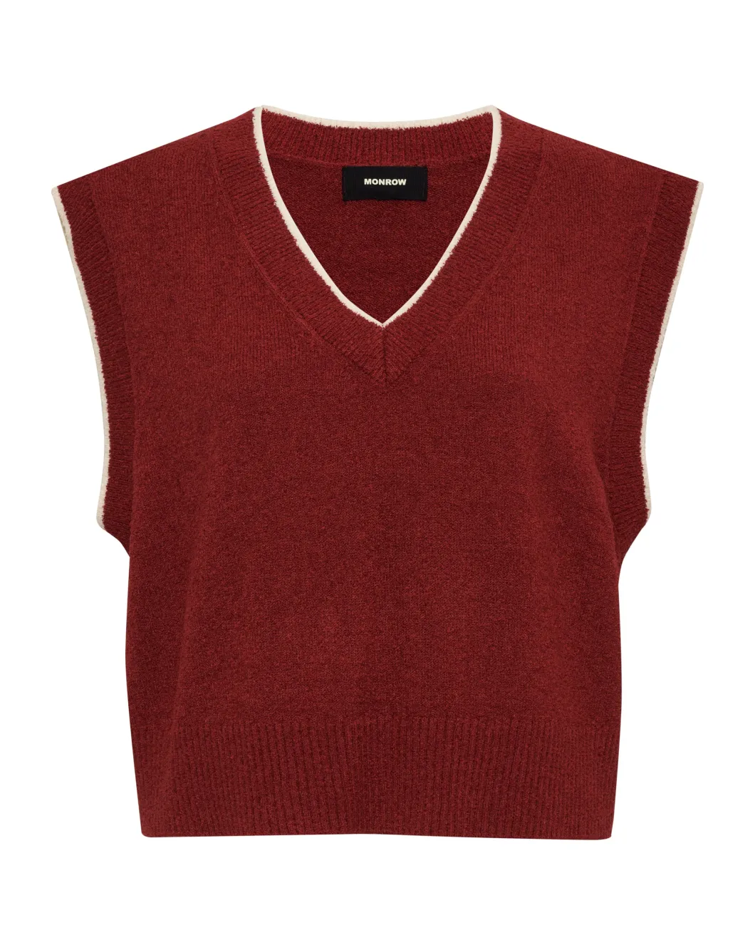- Lightweight textured yarn and contrast tipping at the V-neck and armholes add modern, refined details