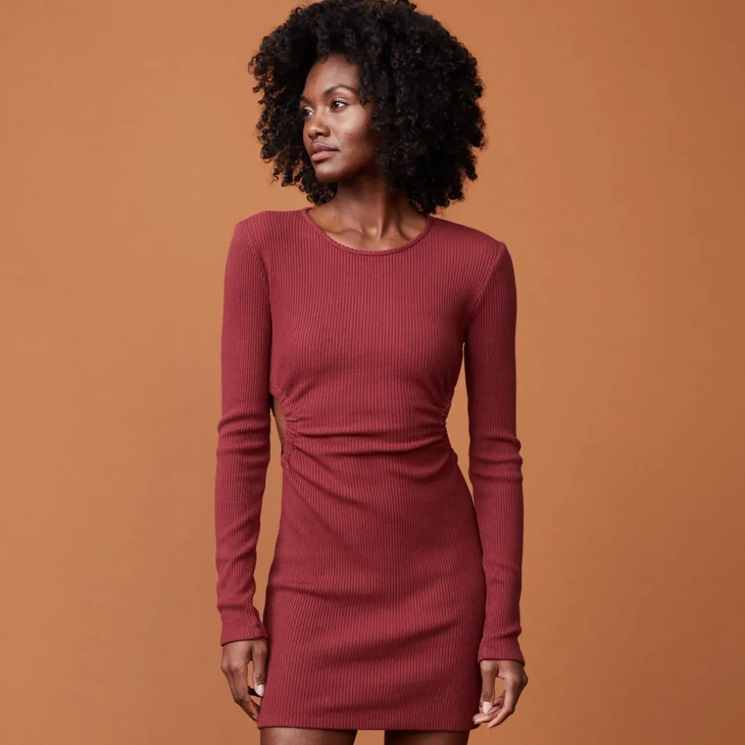 The Brushed Rib Cut-Out Dress features a body-hugging silhouette, with a scooped neckline, long sleeves, and two cut-out shirred details to accentuate your waistline.