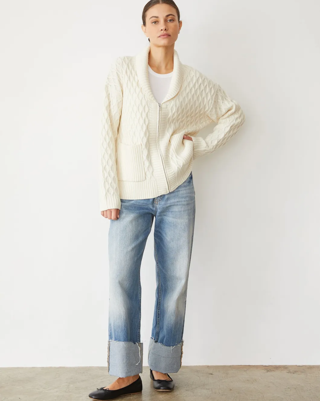 Embrace the warmth of our Cable Knit Zip Cardigan, crafted from a luxurious wool and alpaca blend that combines cozy comfort with timeless style.