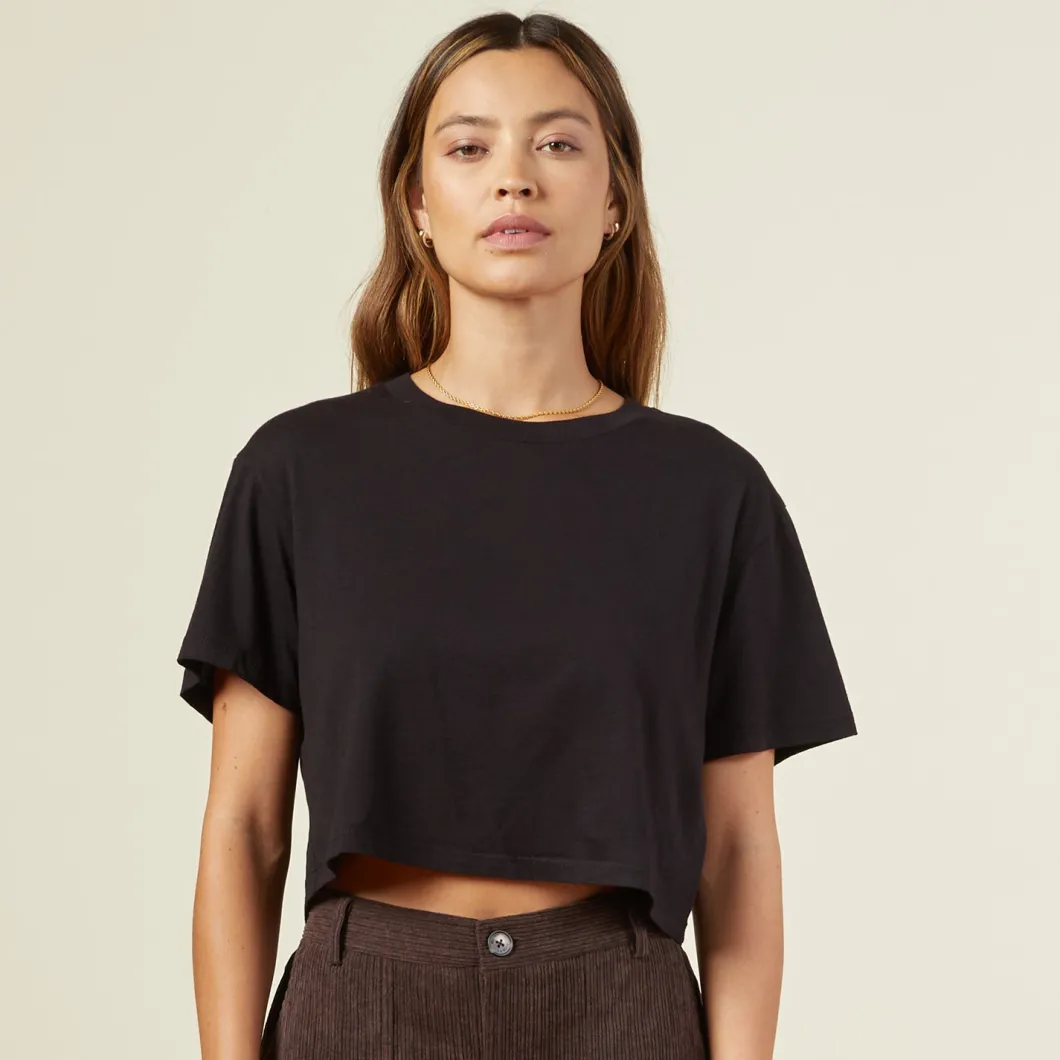 - Made from 100% cotton, this cropped short sleeve relaxed crew neck is ultra-soft and has that laid-back (but never lazy) fit.