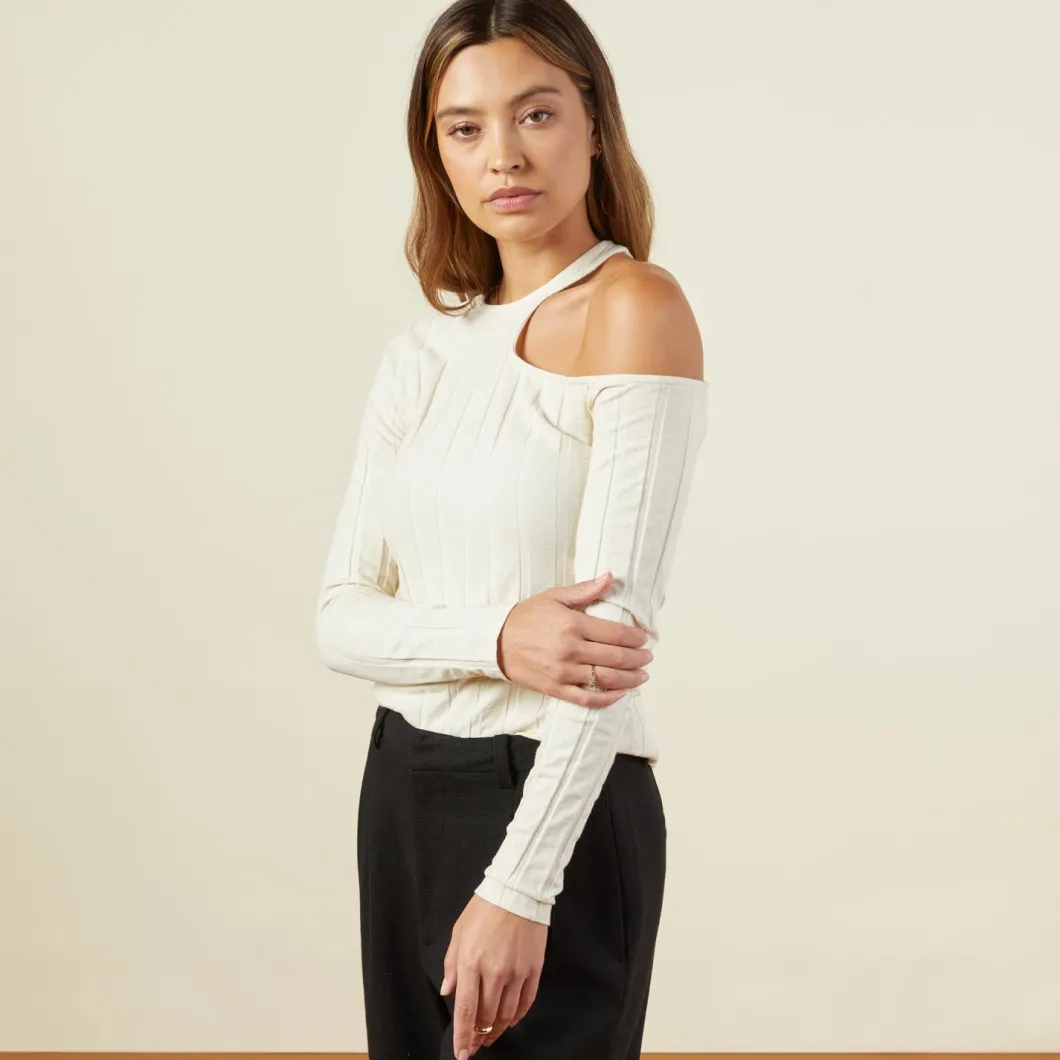 The Flat Rib Asymmetric Long Sleeve is not your average top. This long sleeve features an asymmetric, cold-shoulder opening. Made from a cotton/spandex blend, this long sleeve is body-hugging and comfortable.