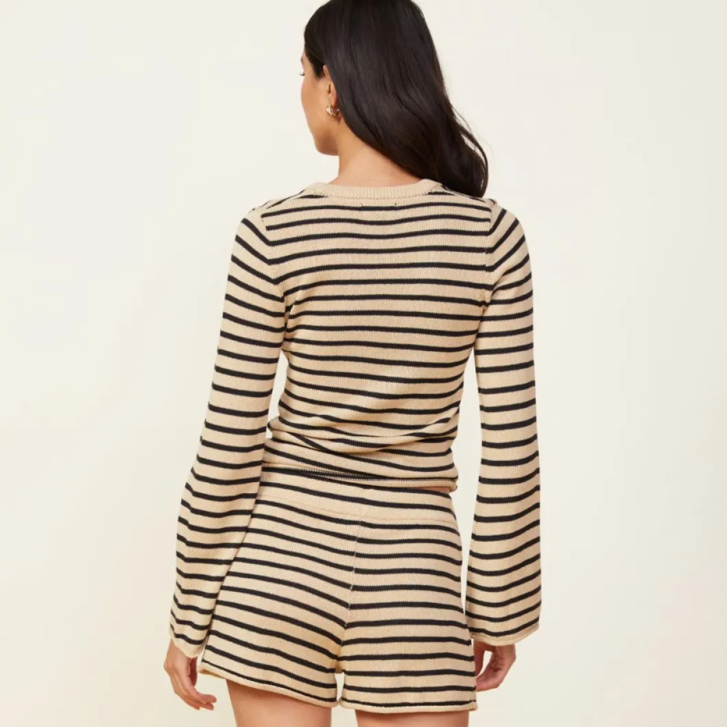 MONROW Linen Sweater Long Sleeve Top ECRU/BLKSTRIPE Fashion