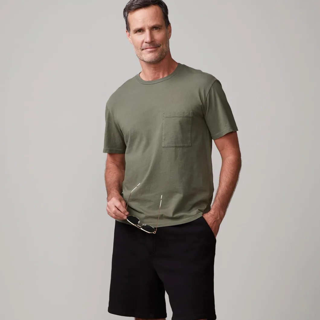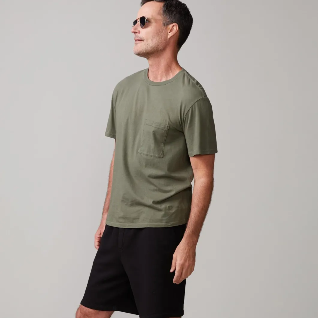 - Made from 100% cotton, this short sleeve relaxed crew neck is ultra-soft and has that laid-back (but never lazy) fit. Bonus feature: front pocket.