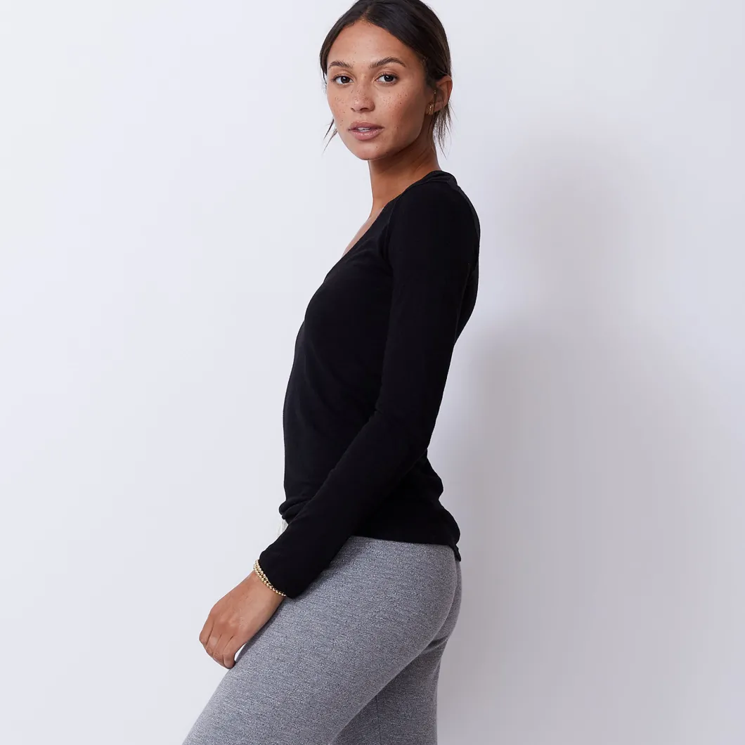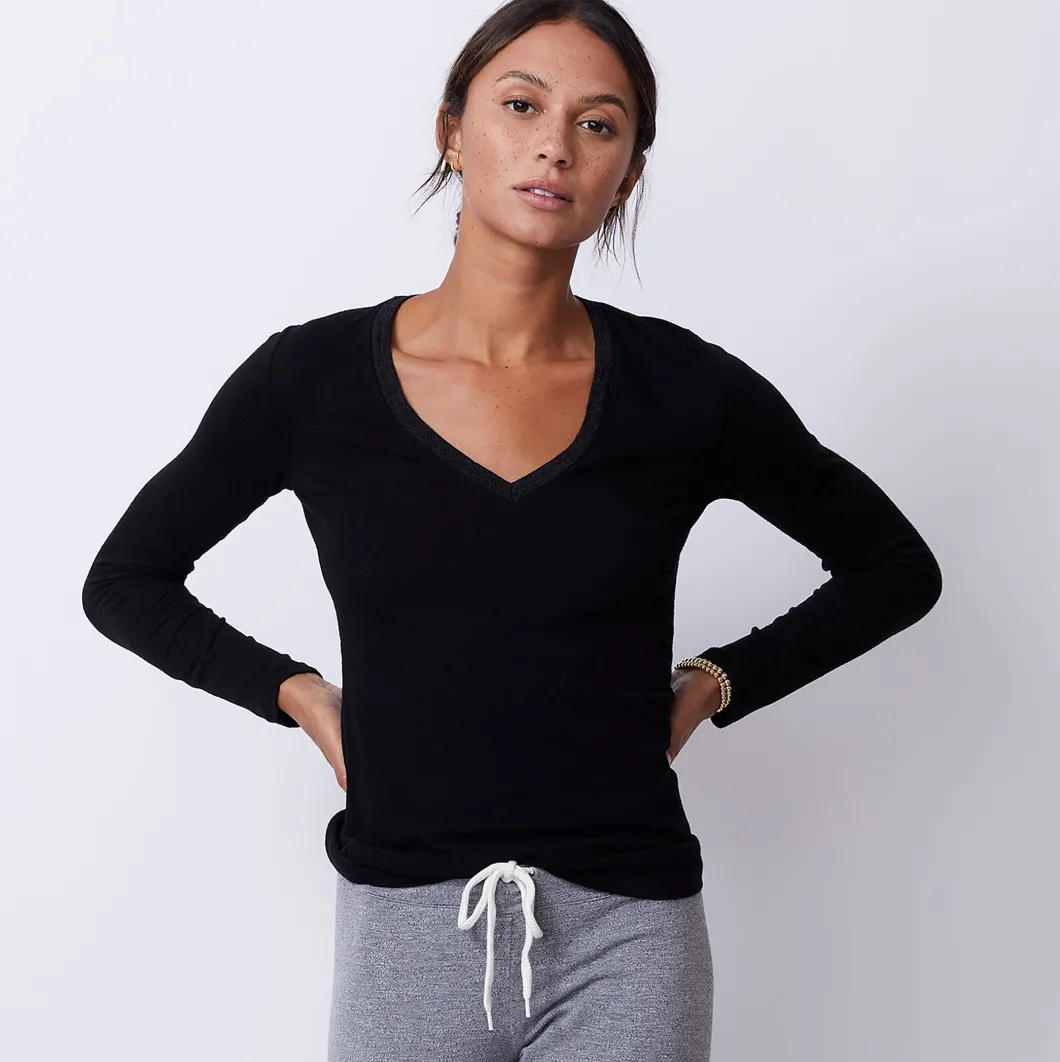 - Meant to hug curves rather than hide them, this long sleeve fitted v neck is the ideal base layer (under a blazer at work, or a zip-up on the weekends) and it works well solo. The wide set neck line accentuates the collar bones while the subtly sexy v rests comfortably in the center of your breast bone to keep you covered. Between the soft tri-blend fabric and the way it tucks smoothly into waistbands, you’ll find a way to wear this with pretty much everything.