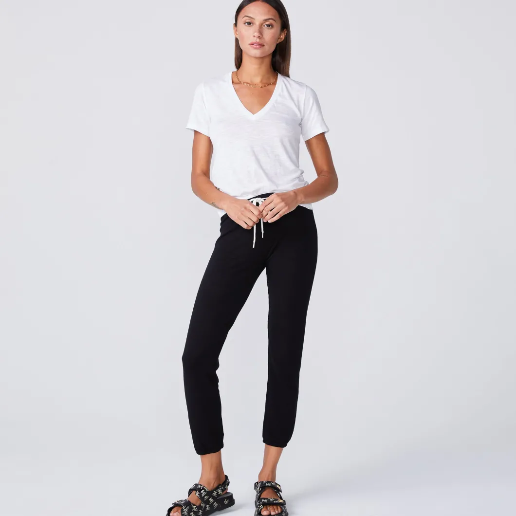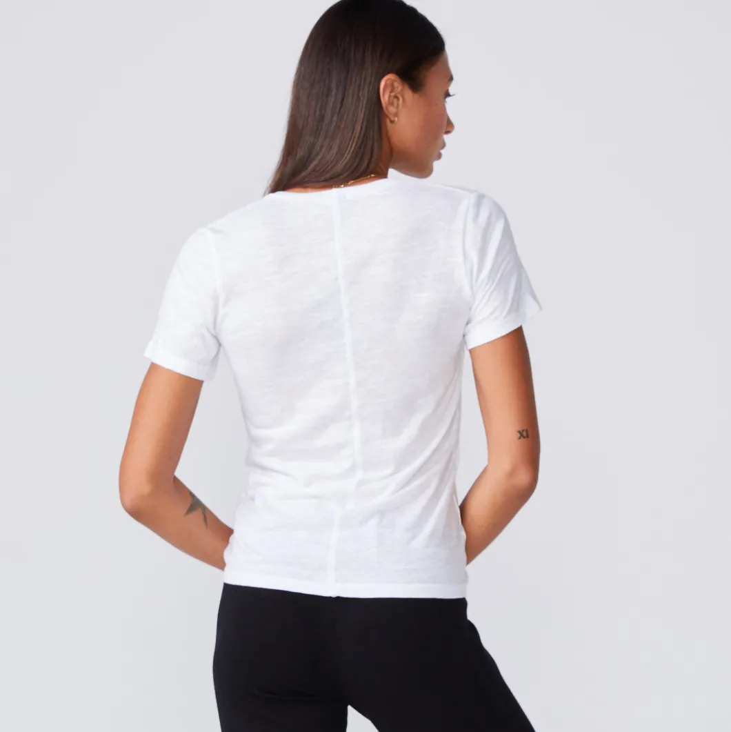 - Cut in our classic textured tri-blend, this subtly sexy V-neck is low (but not too low.) The fitted body makes it perfect to layer under your favorite zip up or cardigan but it’s just as cute on its own. The quintessential style and universal color means sweats, leggings and all manner of denim are fair game.