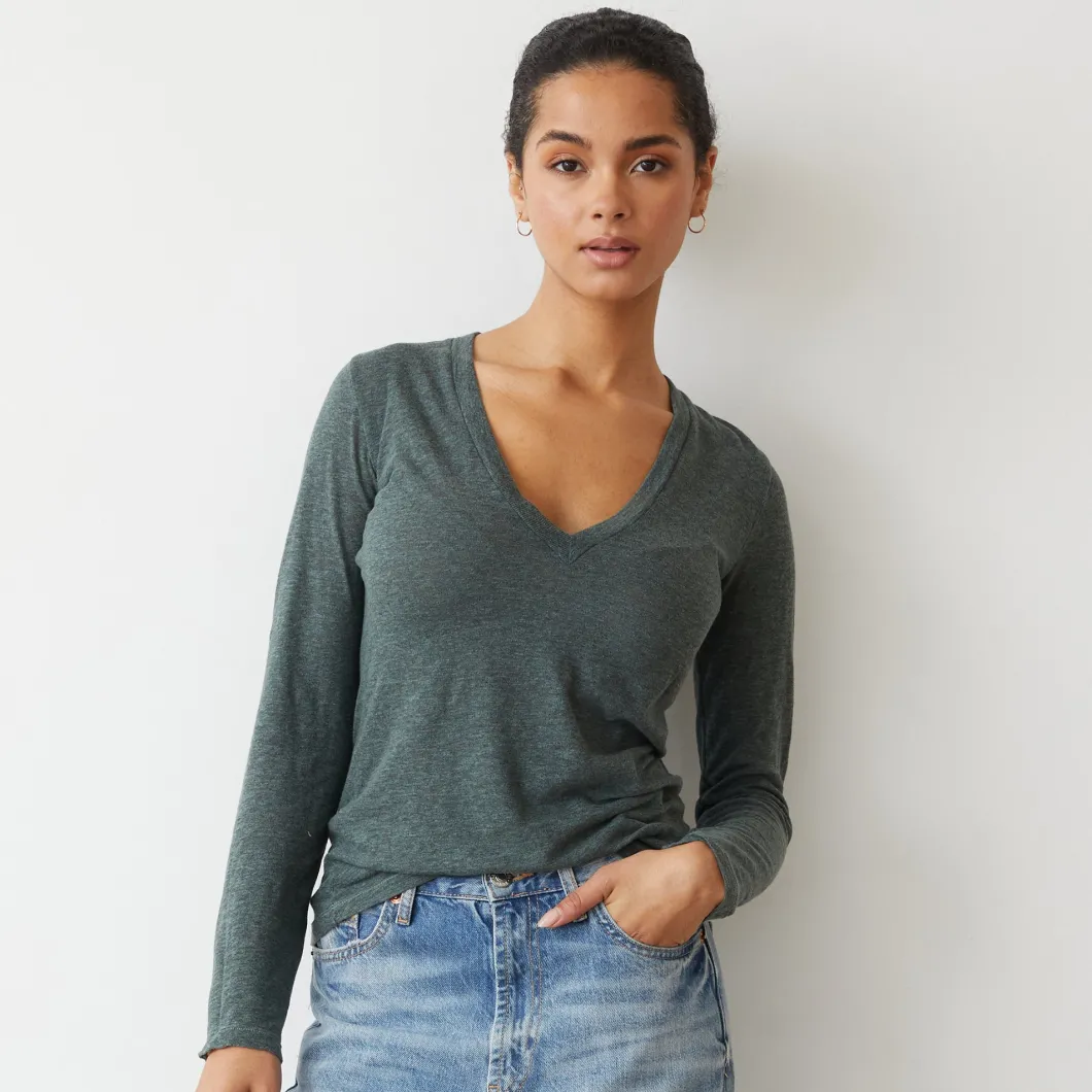 - Meant to hug curves rather than hide them, this long sleeve fitted v neck is the ideal base layer (under a blazer at work, or a zip-up on the weekends) and it works well solo. The wide set neck line accentuates the collar bones while the subtly sexy v rests comfortably in the center of your breast bone to keep you covered. Between the soft tri-blend fabric and the way it tucks smoothly into waistbands, you’ll find a way to wear this with pretty much everything.