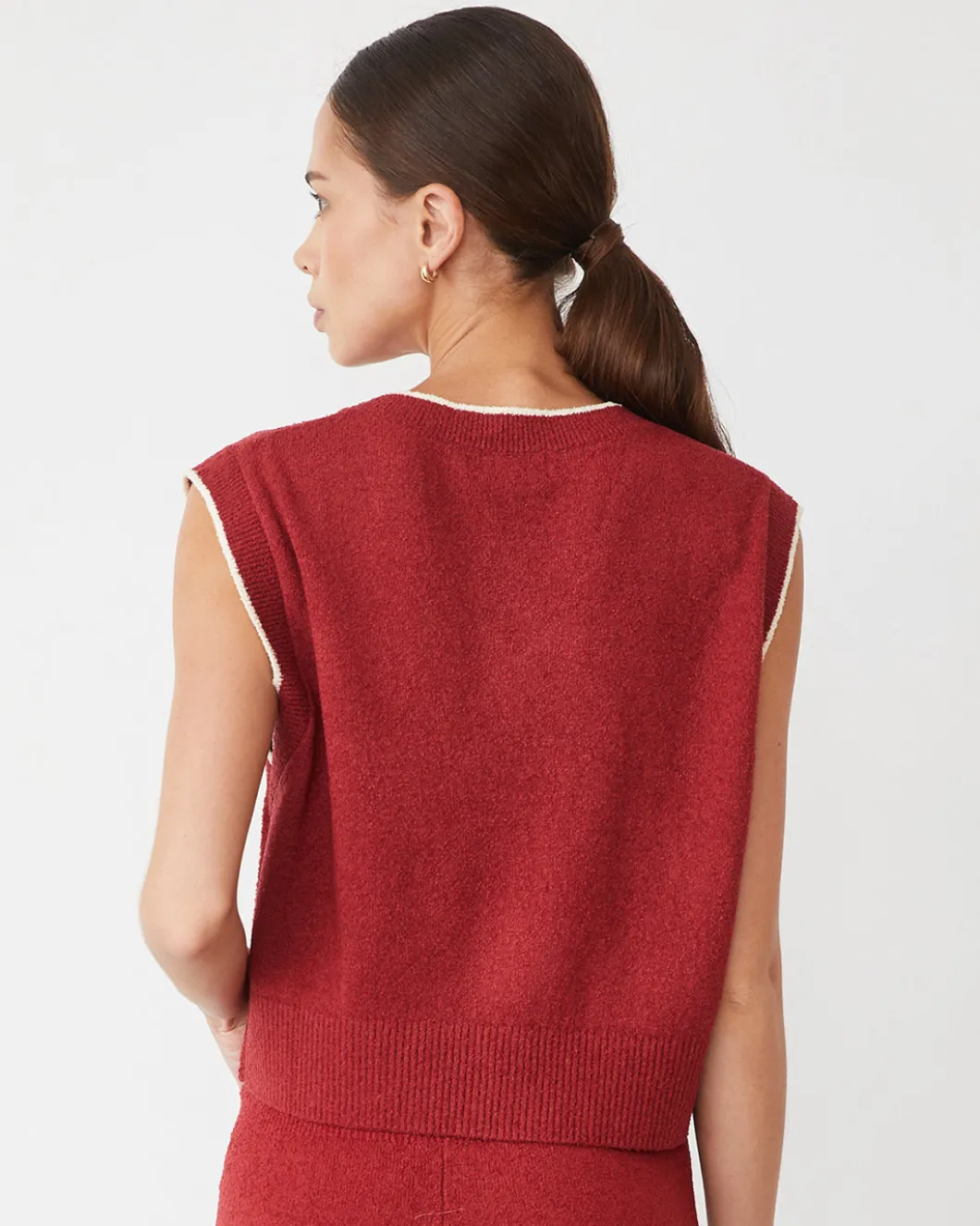 - Lightweight textured yarn and contrast tipping at the V-neck and armholes add modern, refined details