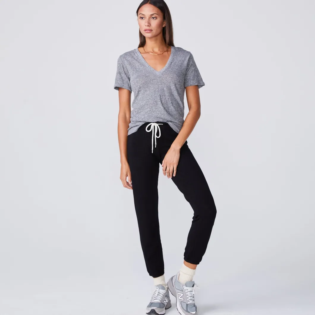 - Cut in our classic textured tri-blend, this subtly sexy V-neck is low (but not too low.) The fitted body makes it perfect to layer under your favorite zip up or cardigan but it’s just as cute on its own. The quintessential style and universal color means sweats, leggings and all manner of denim are fair game.