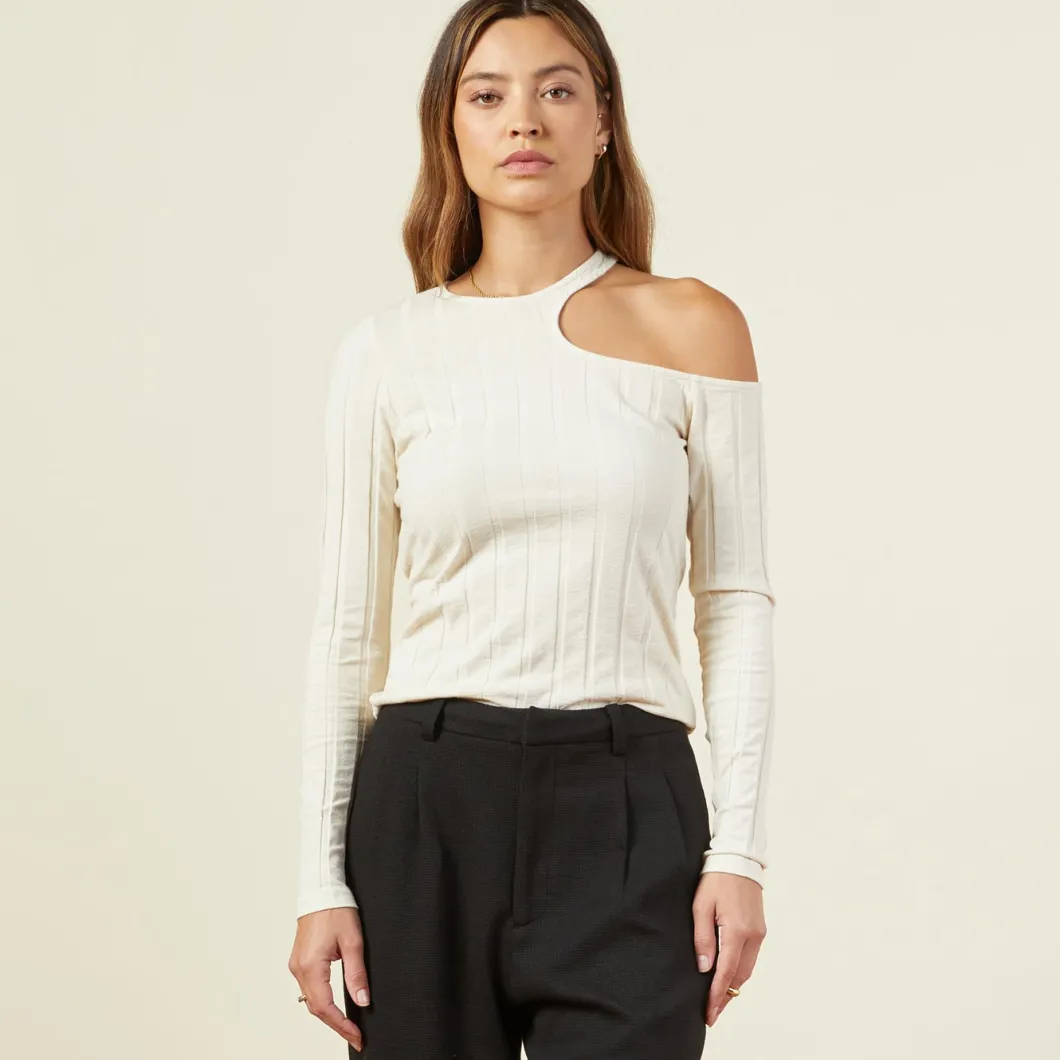 The Flat Rib Asymmetric Long Sleeve is not your average top. This long sleeve features an asymmetric, cold-shoulder opening. Made from a cotton/spandex blend, this long sleeve is body-hugging and comfortable.