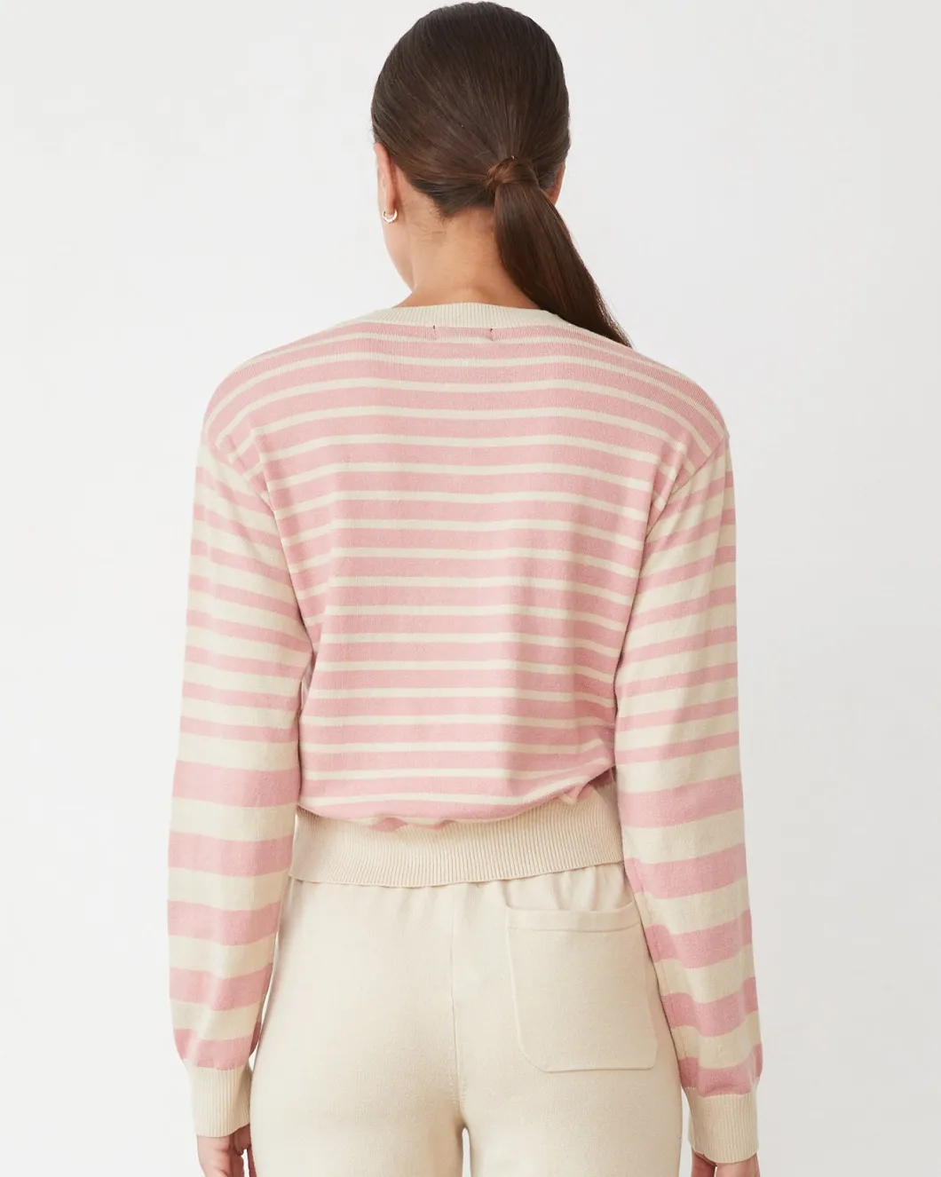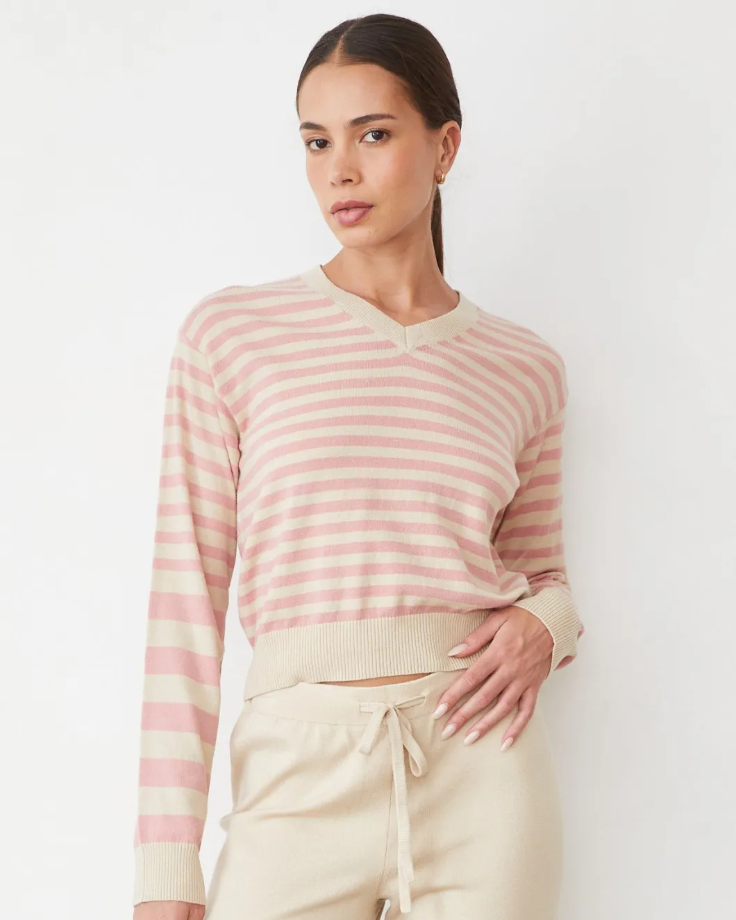 MONROW Lightknit Stripe V Neck SAND/CHALKPINK Sale