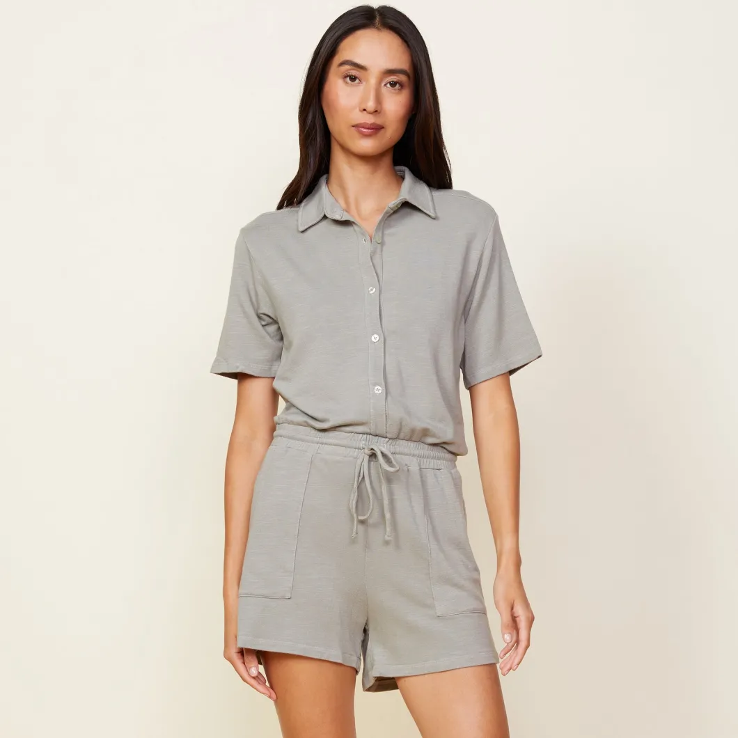 - The Supersoft Romper features a polo neckline with buttons down to the waistline, t-shirt length sleeves, and a comfortable waistband.