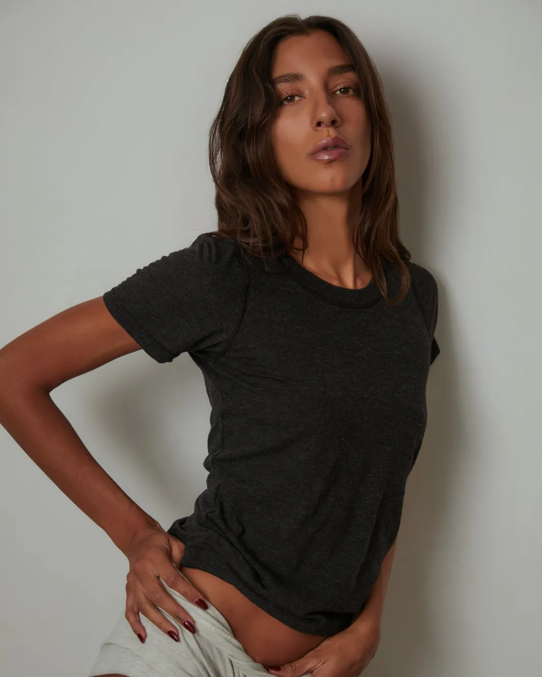 - Our best-selling crew neck tee is the kind of forever favorite you’ll want in every fabric and color. The most fitted of the crews, this tee is cute enough on its own and even better tucked into trousers. Throw a cute blazer or zip-up sweatshirt over it and it acts as the perfect base layer. Shown here in our textured tri-blend fabric.