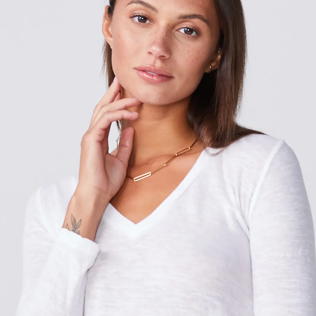 - Meant to hug curves rather than hide them, this long sleeve fitted v neck is the ideal base layer (under a blazer at work, or a zip-up on the weekends) and it works well solo. The wide set neck line accentuates the collar bones while the subtly sexy v rests comfortably in the center of your breast bone to keep you covered. Between the soft tri-blend fabric and the way it tucks smoothly into waistbands, you’ll find a way to wear this with pretty much everything.