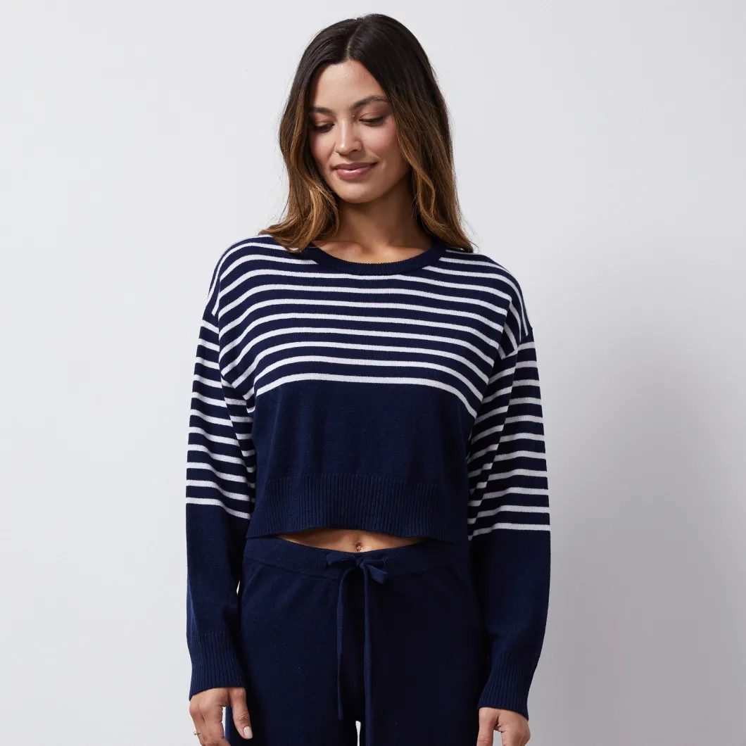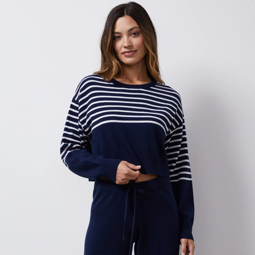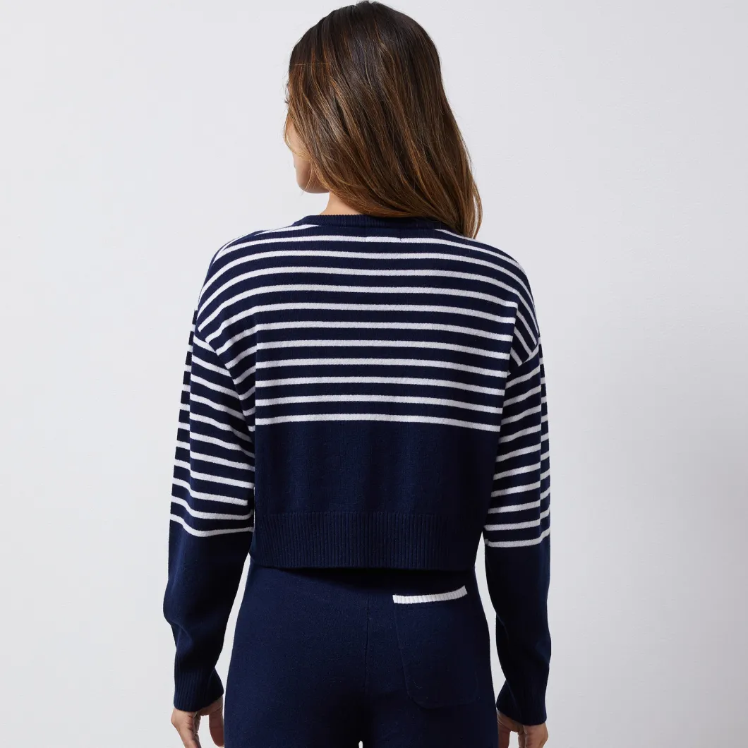 MONROW Wool Cashmere Stripe Crew Neck Sweater NAVY/IVORY Online